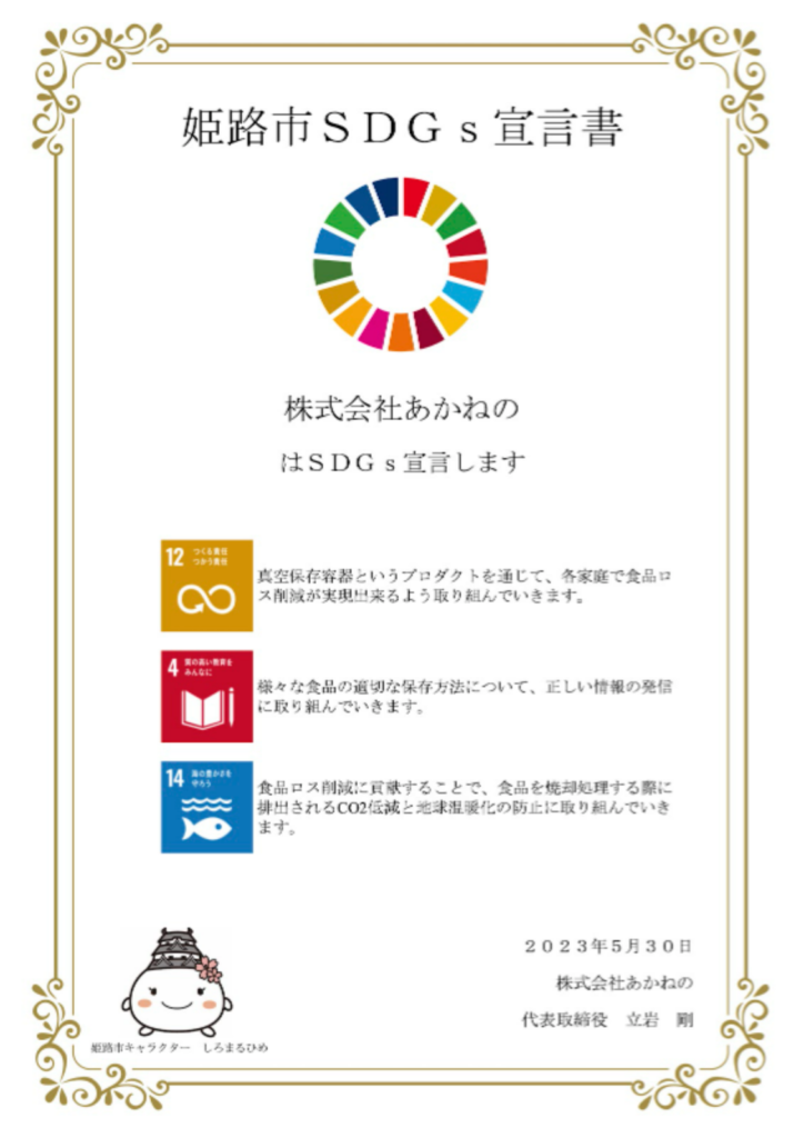 真空保存容器というプロダクトを通じて食品ロスの削減を目指す弊社は、このたび兵庫県姫路市の推進する「姫路市SDGs宣言」に参画いたしました。